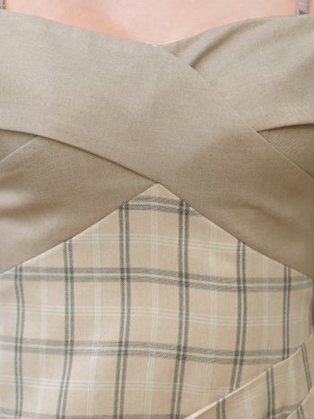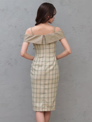 4. 予約商品【2月下旬入荷予定】【Veautt/ヴュート】肩あき ウエストタック スリット チェック柄 バイカラー 2way オフショルダー 膝丈ドレス (VT032602)