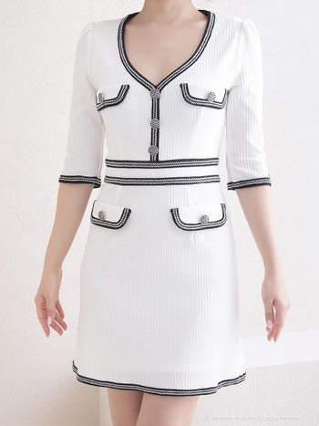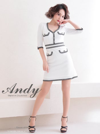 キャバドレス Andy パイピング 袖あり ポケット ボタン バイカラー フレアニドレス