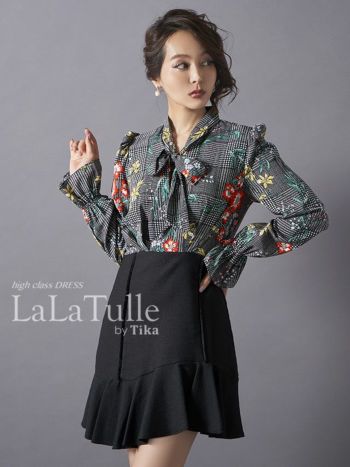 キャバドレス LaLatulle ララチュール グレンチェック×花柄ブラウス風ミニドレス(1color)(S/M/L)(青田夏奈 着用)【送料無料】