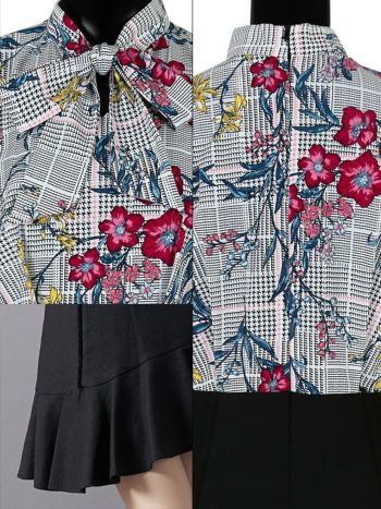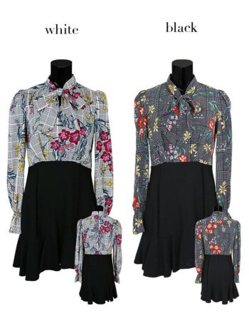 4. グレン チェック×花柄ブラウス風 フレアミニドレス[2color][Lあり][青田夏奈/キャバドレス着用]