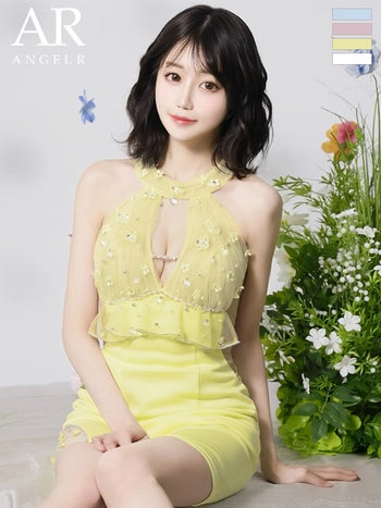 キャバドレス Angel R エンジェルアール くびれ透け バストカット ホルターネック フラワー レース フリル ビジュー フェミニン タイトミニドレス