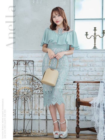 キャバドレス Anella シフォン 肩フリル 袖あり シアー フリルネック ハイウエスト切替 タイトひざ丈ドレス