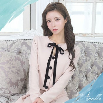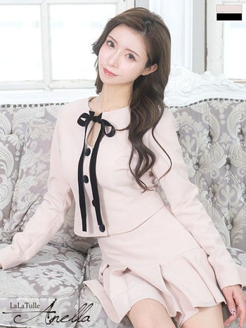 キャバドレス Anella ネックリボン ボタン セットアップ ワンカラー 長袖 プリーツ フレアミニドレス