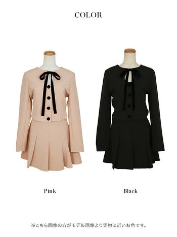 Lあり!エレガントガーリーなセットアップ♡ 【Anella/アネラ】ネックリボン ボタン セットアップ ワンカラー 長袖 プリーツ フレアミニドレス