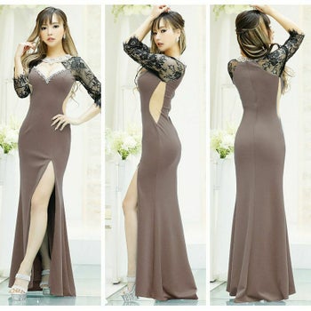 5. 【Angel R/エンジェルアール】大人美麗 セクシー ビジューデザインレーススリーブスリット入り タイトロングドレス (AR22308)