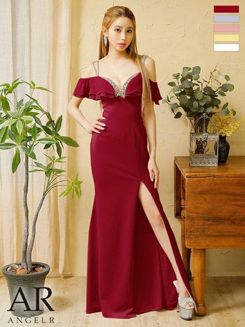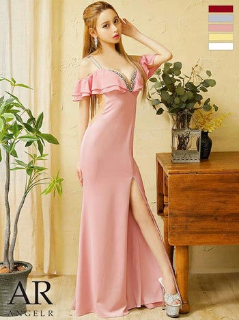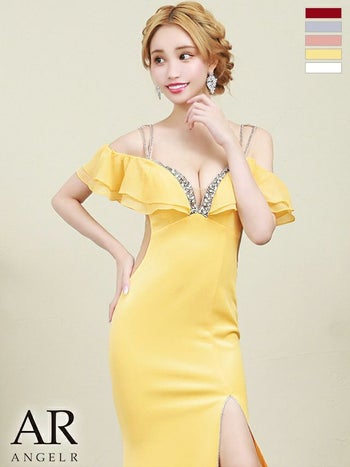 キャバドレス ミニドレス Angel R エンジェルアール オープンショルダー フリル ワンカラー ビジュー スリット タイトロングドレス