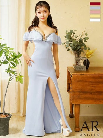 キャバドレス ブランドドレス Angel R エンジェルアール フリル オープンショルダー ワンカラー スリット ビジュー タイトロングドレス