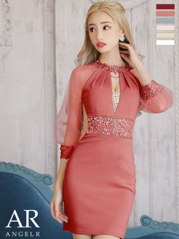 5. 【Angel R/エンジェルアール】ラグジュアリー メッシュスリーブウエスト フラワーレース ビジュー シースルー ワンカラー 袖あり タイトミニドレス (AR22806)