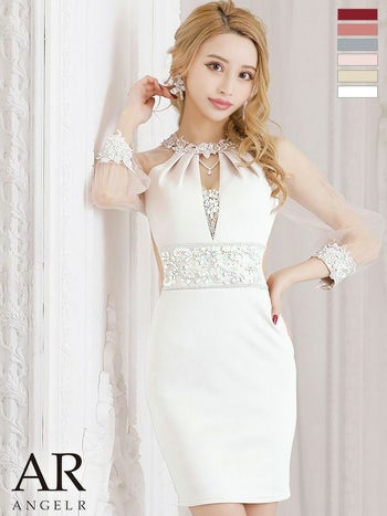 5. 【Angel R/エンジェルアール】セクシー メッシュスリーブウエスト フラワーレース ビジュー シースルー ワンカラー 袖あり タイトミニドレス (AR22806)