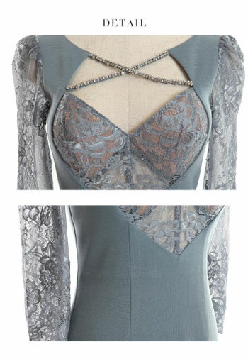 ROBEdeFLEURS Glossy[ローブドフルール グロッシー]袖あり 七分袖 クロス ビジュー レース シースルー 高級ミニドレス[トランキルブルー][XS/Lあり][ゆめ/キャバドレス着用][3118]