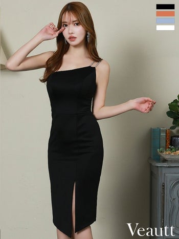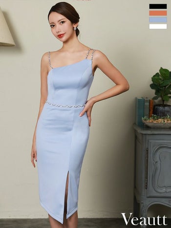 キャバドレス 高級 Veautt ヴュート ワンカラー パールビジュー ベルト キャミソール スリット ひざ丈ドレス