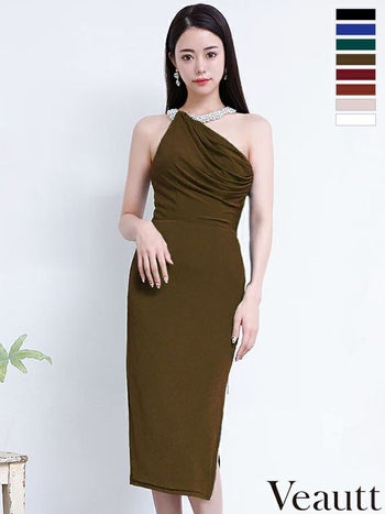 キャバドレス Veautt ヴュート ジップデザイン エレガント ワンカラー ネックビジュー ドレープデザイン タイト スリット 膝丈ドレス