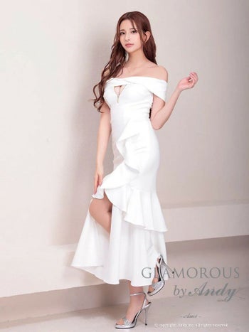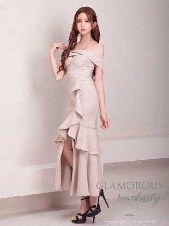 キャバドレス ロングドレス GLAMOROUS グラマラス ジップデザイン アシンメトリー マーメイド スリット フリル ワンカラー オフショルダー 半袖 マーメイドロングドレス