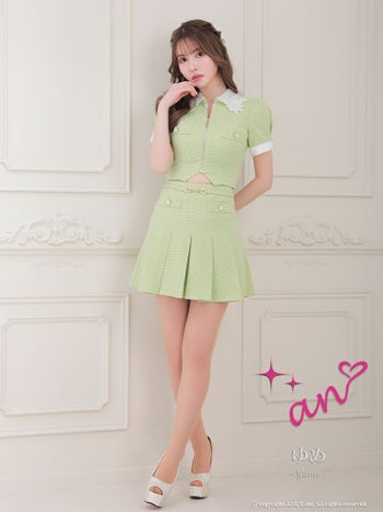 XSあり!ショート丈のトップスにプリーツスカートでガーリーに♪ 【an/アン】セットアップ 襟付き ジップデザイン 半袖 プリーツ パフスリーブ Aライン フレアミニドレス(aoc3638)