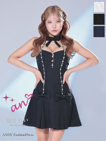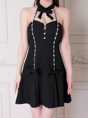 3. 【an/アン】ビジュー リボン ワンカラー バストカット チョーカー ホルターネック フレアミニドレス(aoc3920)