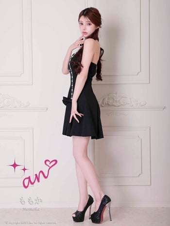 4. 【an/アン】ビジュー リボン ワンカラー バストカット チョーカー ホルターネック フレアミニドレス(aoc3920)