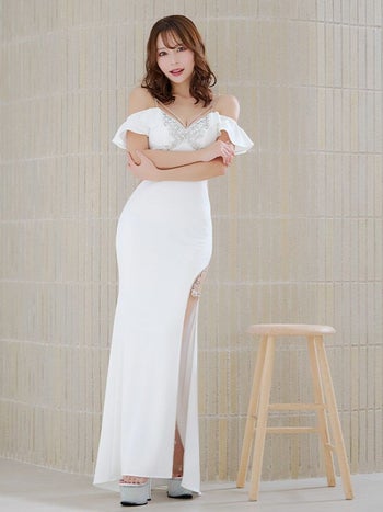 キャバドレス Angel R 肩あき ビジュー くびれ透け エレガント メッシュ スリット フリル オープンバスト タイトロングドレス