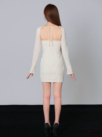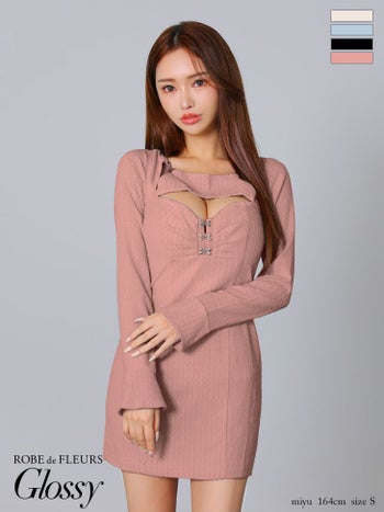 5. 【Glossy by ROBE de FLEURS/グロッシー】長袖 バックオープン リボン ワッフル セクシー バストカット タイトミニドレス (GL3584)