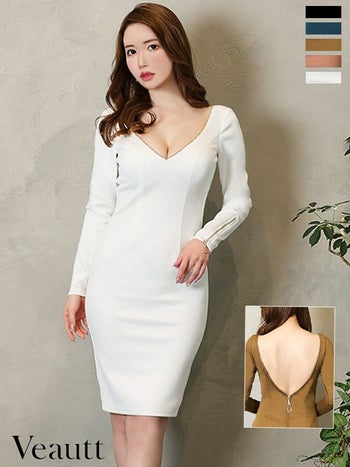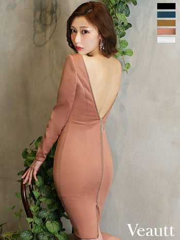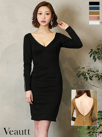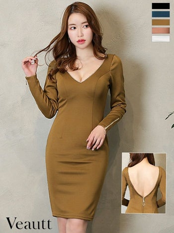 5. 【Veautt/ヴュート】スタイルアップ バストビジューバックオープンファスナー ジップ 袖あり ワンカラー タイトひざ丈ドレス (VT04232)