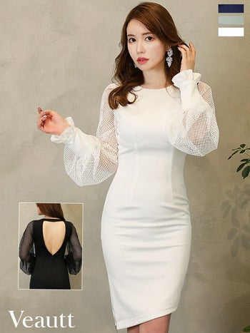 XSあり!メッシュから透ける素肌とバックオープンデザインがSEXY☆ 【Veautt/ヴュート】セクシー メッシュスリーブバックオープン ワンカラー 袖あり タイトひざ丈ドレス (VT08238)