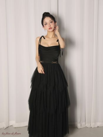 3. 【ROBEdeFLEURS/ローブドフルール】 キャミソール ドレープネック ティアードスカート サテン チュール Aラインロングドレス (LF4636)