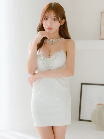 3. 【Angel R/エンジェルアール】シフォンドレープ パールチェーン ビジュー ホルターネック タイトミニドレス (AR25230)