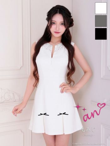 XSあり!背中開きデザインで後ろ姿まで綺麗に魅せる♪ 【an/アン】ノースリーブ ジップデザイン バックカット プリーツ リボン ビジュー フレアミニドレス(aoc4027)