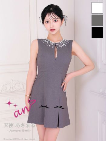 キャバドレス an ノースリーブ ジップデザイン バックカット プリーツ リボン ビジュー フレアミニドレス