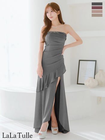 3. 【Angel R/エンジェルアール】フリル ラッフルデザイン ベアトップ キャミソール スリット ビジュー ラメ ビジュー タイトロングドレス (AR25246)