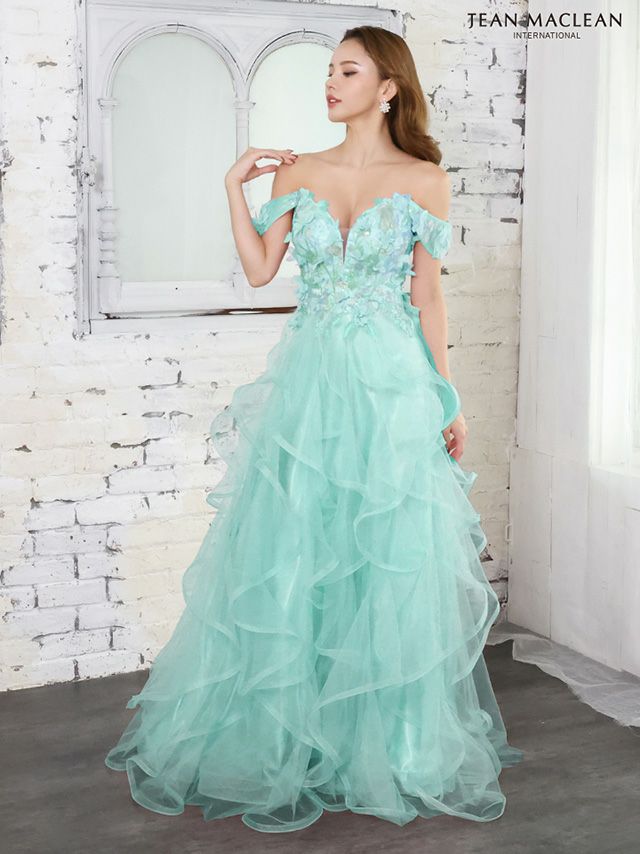 特別な日にぴったりな高級キャバドレス♪ 【JEANMACLEAN/ジャンマクレーン】立体フラワーモチーフ オフショルダー チュールレース ワンカラー フレアロングドレス(41616)