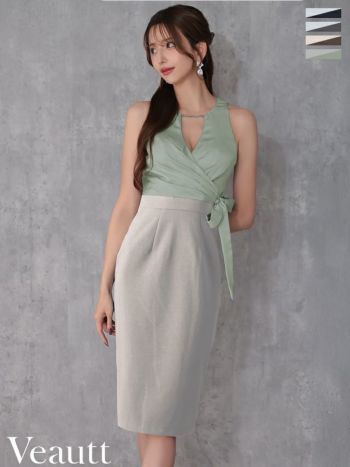 キャバドレス Veautt ヴュート ノースリーブ バストタック チェーン ウエストクロス リボン ジップデザイン バイカラー 膝丈ドレス