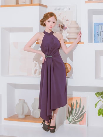 XSあり!アシメ裾がエレガントな動きに♪ 【Veautt/ヴュート】ホルターネック ウエストベルト アシンメトリー ワンカラー タック 膝丈ドレス (VT022601)