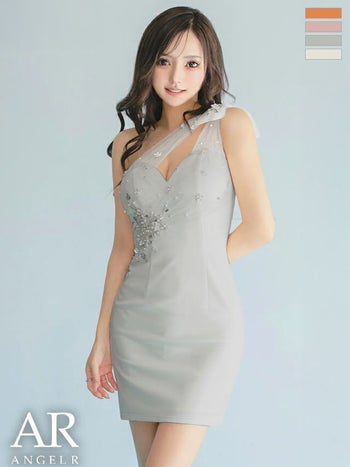 キャバドレス Angel R エンジェルアール フラワー チュール ワンショルダー リボン メッシュ ビジュー タイトミニドレス