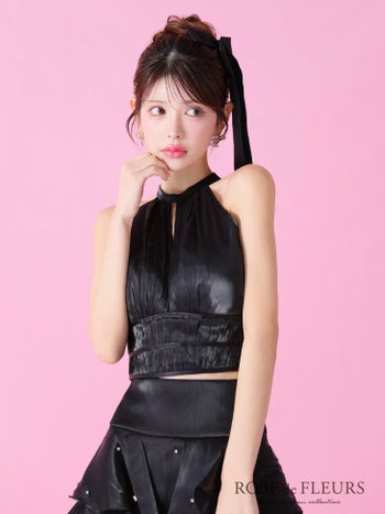 キャバドレス ROBEdeFLEURS ローブドフルール サテン ビジュー ティアード セットアップ ガーリー バストカット ホルターネック フレアミニドレス