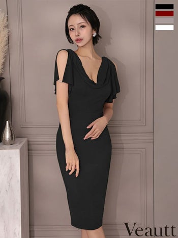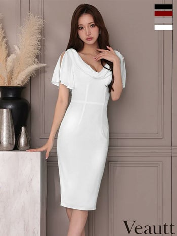 キャバドレス Veautt ヴュート バストドレープ 半袖 フレア スリット パールチャーム エレガント 膝丈ドレス
