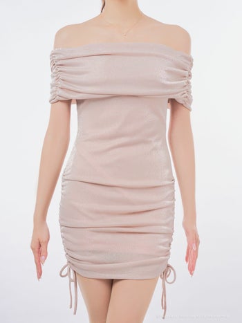 オフショルダー ラメ ギャザー ドロスト リボン タイトミニドレスのメイン画像1