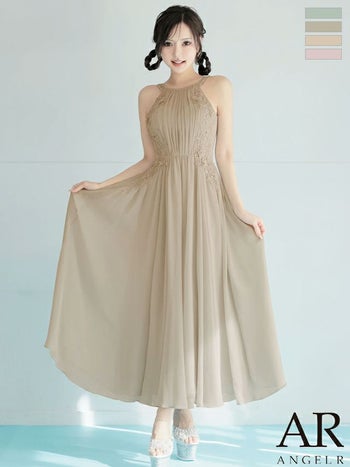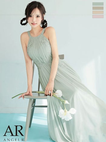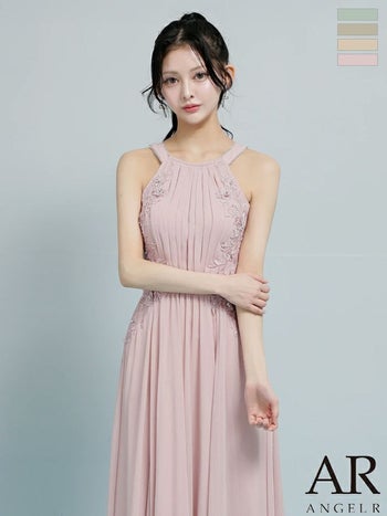 キャバドレス Angel R エンジェルアール リボン ビジュー フラワーレース ホルターネック プリーツ Aラインロングドレス