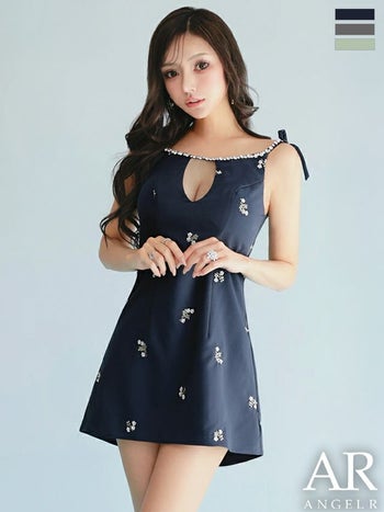キャバドレス Angel R エンジェルアール ショルダーリボン バストカット フラワー刺繍 ビジュー キャミソール フレアミニドレス