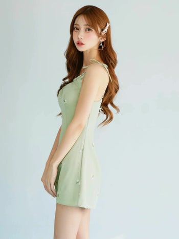 4. 【Angel R/エンジェルアール】ショルダーリボン バストカット フラワー刺繍 ビジュー キャミソール フレアミニドレス (AR26201)