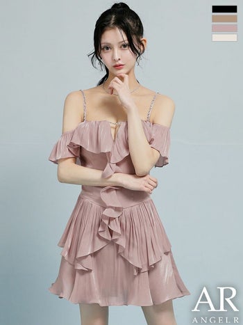 XSあり!シーンに合わせて着こなしのアレンジが可能♪ 【Angel R/エンジェルアール】バストカット ビジューチェーン フリル シフォン オフショルダー 肩あき フレアミニドレス (AR26806)