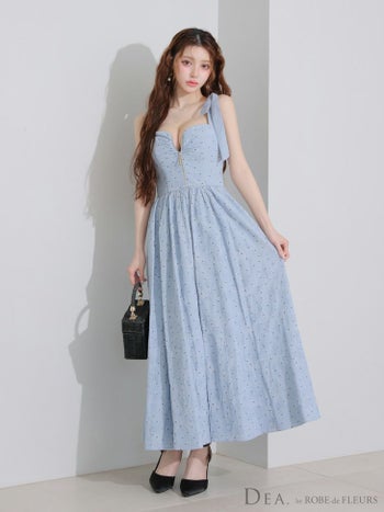 キャバドレス DEA. ROBE de FLEURS. ディア ローブドフルール ドット柄 ショルダーリボン ノースリーブ ジップデザイン ガーリー フレアロングドレス