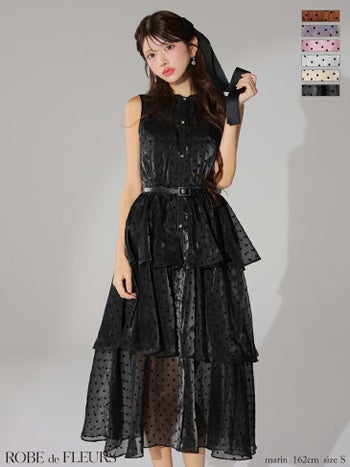 キャバドレス ROBEdeFLEURS ローブドフルール ガーリー ノースリーブ ベルト付き ドット柄 オーガンジー ティアード Aラインロングドレス