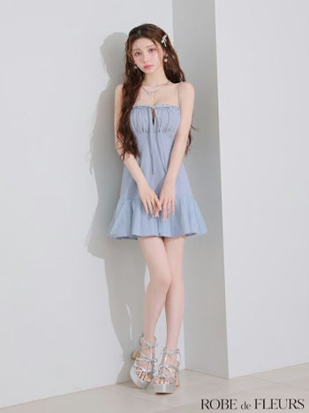 3. 【ROBEdeFLEURS/ローブドフルール】キャミソール 胸元ギャザー バストカット リボン ビジュー フレアミニドレス (fm4115)