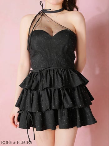 キャバドレス ROBEdeFLEURS ローブドフルール ワンショルダー ラインストーン セットアップ チュール フリル ティアード リボン フレアミニドレス