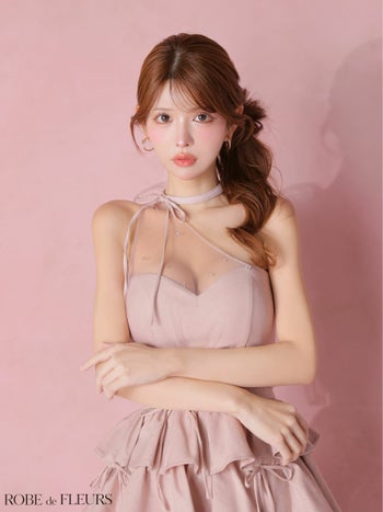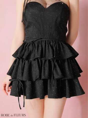キャバドレス ROBEdeFLEURS ローブドフルール セットアップ ティアード リボン チュール フリルワンショルダー ラインストーン フレアミニドレス