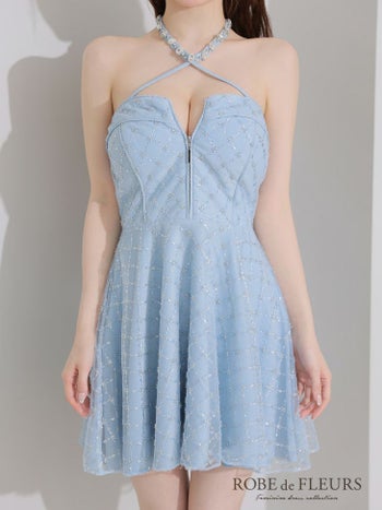 キャバドレス ROBEdeFLEURS ローブドフルール ホルターネック ラメニット ビジュー チュール ジップデザイン ガーリー フレアミニドレス