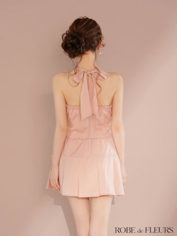 4. 【ROBEdeFLEURS/ローブドフルール】クロスデザイン リボン ホルターネック ビジュー セットアップ フレアミニドレス (fm4400)