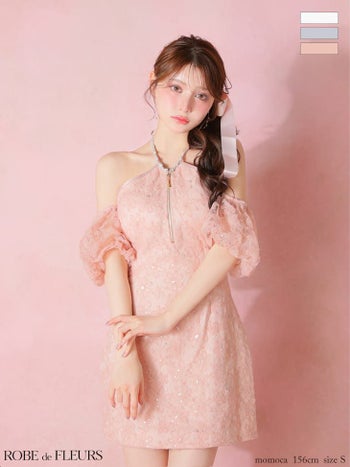 4. 予約商品【1月下旬入荷予定】【ROBEdeFLEURS/ローブドフルール】ホルターネック ジップデザイン 肩あき パフスリーブ フラワーレース ラメチュール 2way タイトミニドレス (fm4404)