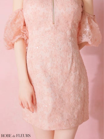 3. 予約商品【1月下旬入荷予定】【ROBEdeFLEURS/ローブドフルール】ジップデザイン 肩あき パフスリーブ フラワーレース ラメチュール 2way ホルターネック タイトミニドレス (fm4404)