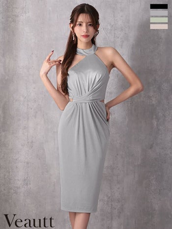 4. 【Veautt/ヴュート】ウエストクロス サイドカット アシンメトリー ホルターネック 膝丈ドレス (VT022603)
